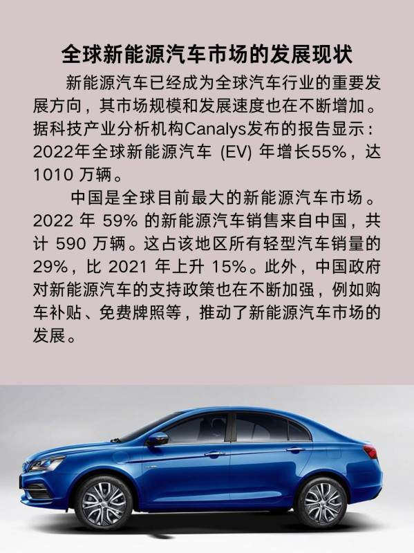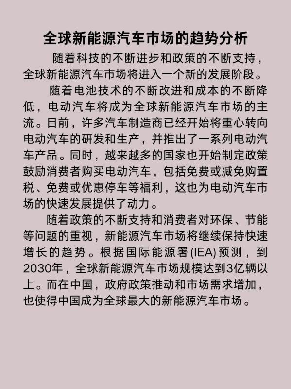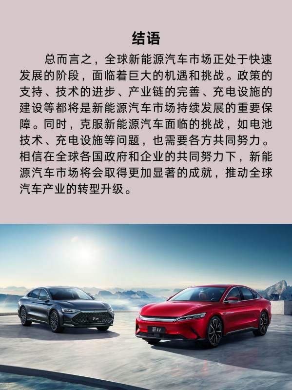 随着科技的不断进步和政策的不断支持,全球新能源汽车市场将进入一个新的发展阶段。