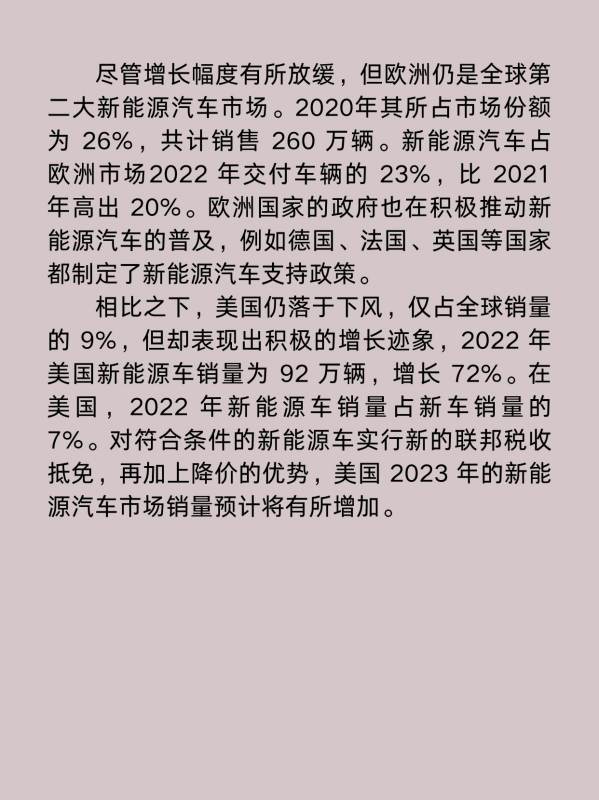 尽管增长幅度有所放缓,但欧洲仍是全球第二大新能源汽车市场。2020年其所占市场份额为26%,共计销售260万辆。新能源汽车占欧洲市场2022年交付车辆的23%,比2021年高出20%。欧洲国家的政府也在积极推动新能源汽车的普及,例如德国、法国、英国等国家都制定了新能源汽车支持政策。