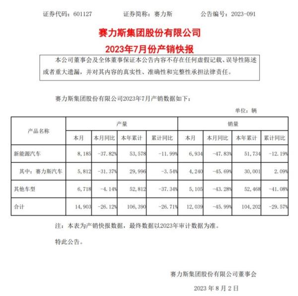 8月1日,作为新造车大军的一员,赛力斯发布了公司7月产销报告记录。今年前7个月,该公司汽车销量为10.42万辆,同比下降29.57%。其中,新能源汽车销量为5.17万辆,环比下降12.19%。