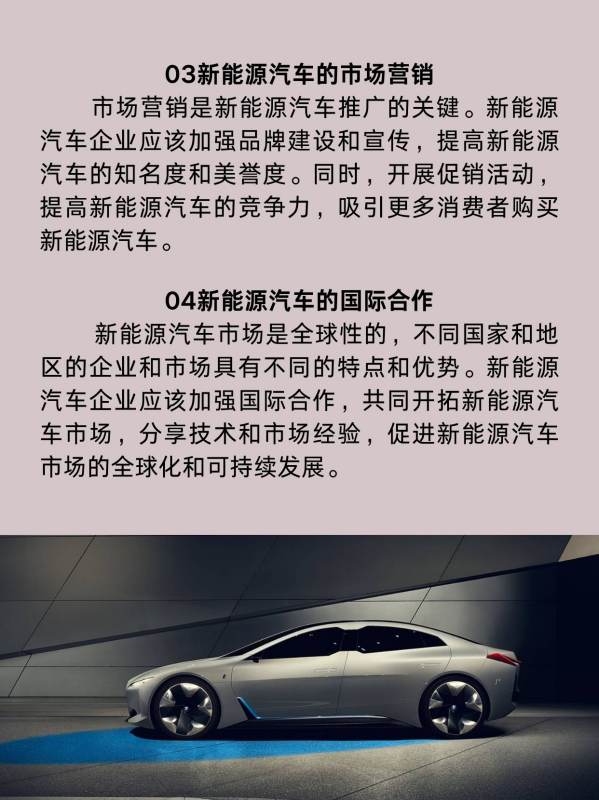 市场营销是新能源汽车推广的关键。新能源汽车企业应该加强品牌建设和宣传,提高新能源汽车的知名度和美誉度。同时,开展促销活动,提高新能源汽车的竞争力,吸引更多消费者购买新能源汽车。