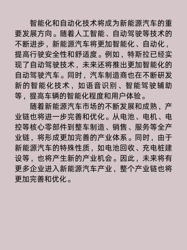 智能化和自动化技术将成为新能源汽车的重要发展方向。随着人工智能、自动驾驶等技术的不断进步,新能源汽车将更加智能化、自动化,提高行驶安全性和舒适度。例如,特斯拉已经实现了自动驾驶技术,未来还将推出更加智能化的自动驾驶汽车。同时,汽车制造商也在不断研发新的智能化技术,如语音识别、智能驾驶辅助等,提高车辆的智能化程度和用户体验。