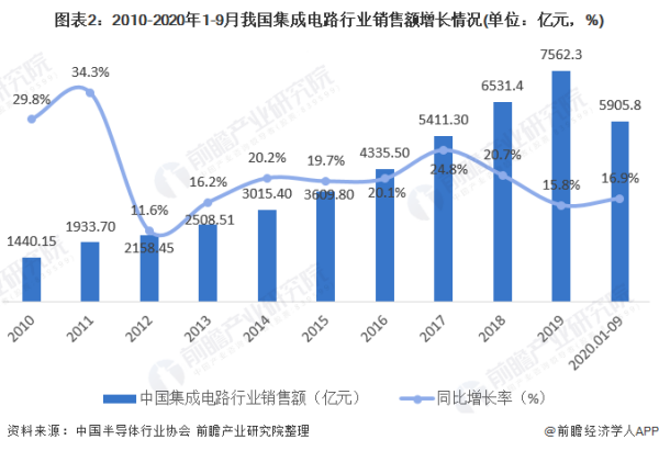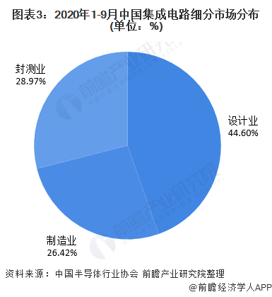 2020年,中国集成电路产业继续保持2位数增长,2020年1-9月,中国集成电路产业销售额为5905.8亿元,同比增长16.9%。其中,设计业同比增长24.1%,销售额2634.2亿元,仍是三业增速最快的产业,占总体行业的比重为44.60%;制造业同比增长18.2%,销售额为1560.6亿元,占比为26.42%;封装测试业同比增长6.5%,销售额1711亿元,占比为28.97%。