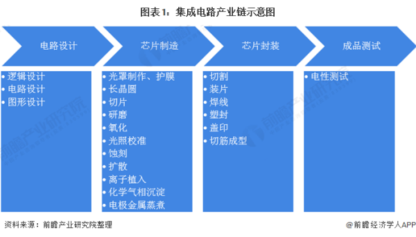 集成电路产业链分为电路设计、芯片制造以及封装与测试三个环节。近年来三个环节出现垂直分工的趋势,并已经发展成为独立电子行业,另外还形成了生产封装材料的集成电路支撑业。