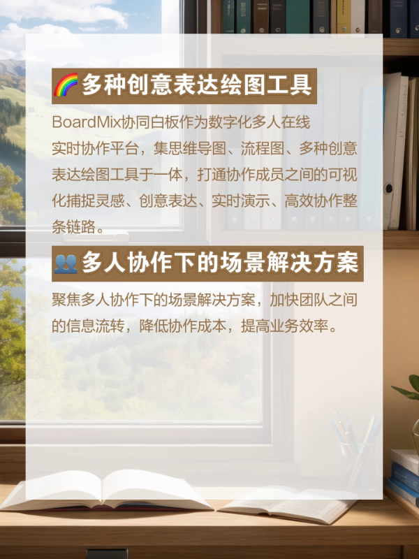 BoardMix协同白板作为数字化多人在线实时协作平台,集思维导图、流程图、多种创意表达绘图工具于一体,打通协作成员之间的可视化捕捉灵感、创意表达、实时演示、高效协作整条链路。