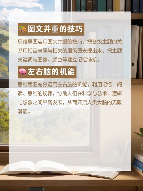 思维导图充分运用左右脑的机能,利用记忆、阅读、思维的规律,协助人们在科学与艺术、逻辑与想象之间平衡发展,从而开启人类大脑的无限潜能。