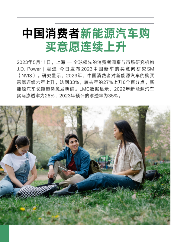 2023年5月11日,上海 — 全球领先的消费者洞察与市场研究机构J.D. Power | 君迪 今日发布2023中国新车购买意向研究SM(NVIS)。研究显示,2023年,中国消费者对新能源汽车的购买意愿连续六年上升,达到33%,较去年的27%上升6个百分点,新能源汽车长期趋势愈发明确。LMC数据显示,2022年新能源汽车实际渗透率为26%,2023年预计的渗透率为35%。