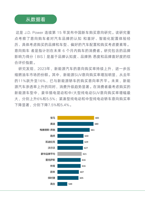 这是 J.D. Power 连续第 15 年发布中国新车购买意向研究。该研究重点考察了意向购车者对汽车品牌的认知 和喜好、智能化配置体验经历、具体考虑购买的品牌和车型、偏好的汽车配置和购买考虑要素等。意向购车 者是指计划在未来 6 个月内购车的消费者。研究包含的品牌影响力得分(BIS)是基于品牌认知度、品牌熟 悉度和品牌喜好度的综合评价指数。