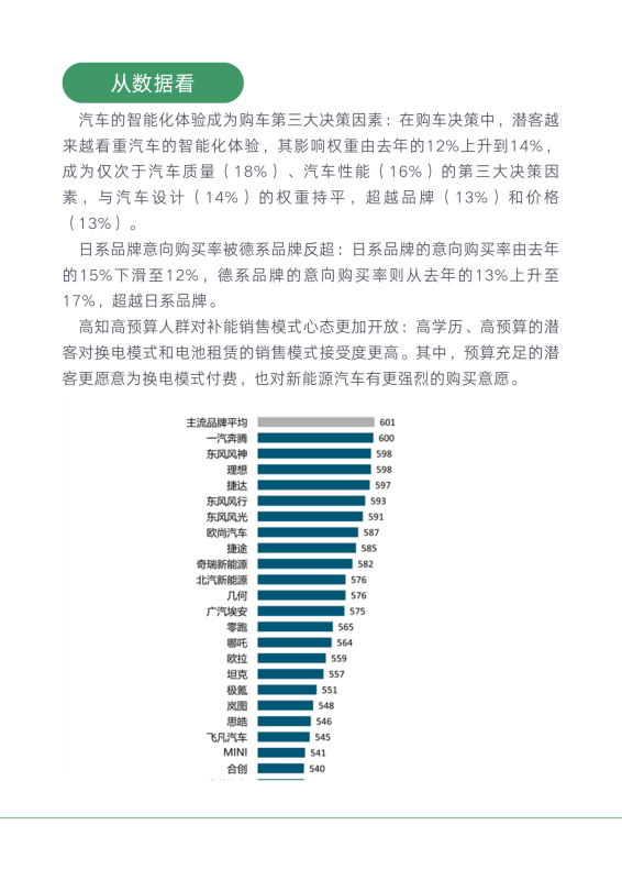 汽车的智能化体验成为购车第三大决策因素:在购车决策中,潜客越来越看重汽车的智能化体验,其影响权重由去年的12%上升到14%,成为仅次于汽车质量(18%)、汽车性能(16%)的第三大决策因素,与汽车设计(14%)的权重持平,超越品牌(13%)和价格(13%)。