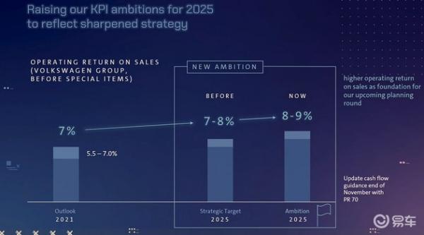 全新战略规划下,大众汽车集团将2025年运营销售收益率期望值从7-8%提高到8- 9%,并以此作为2021年11月的第70轮内部规划的基础。