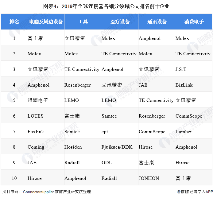 从全球连接器厂商竞争领域来看,TE Connectivity(泰科电子)、Molex(莫仕)、Amphenol(安费诺)这三家美国大型厂商在各个细分领域排名均靠前,泰科、安费诺和莫仕,三家厂商的市场份额约占全球总体份额的30%以上。