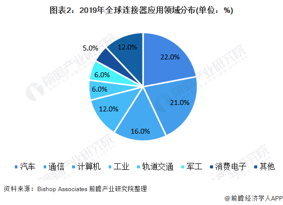 根据Bishop&Associate统计数据,汽车是目前连接器产品中最大的终端设备应用领域,2019年占全球连接器市场的22%。通信行业占比位21%,排在第二位;计算机占比为16%,工业占比为12%,轨道交通占比为6%,其他应用领域主要包括军工、消费电子等行业,占比为23%。