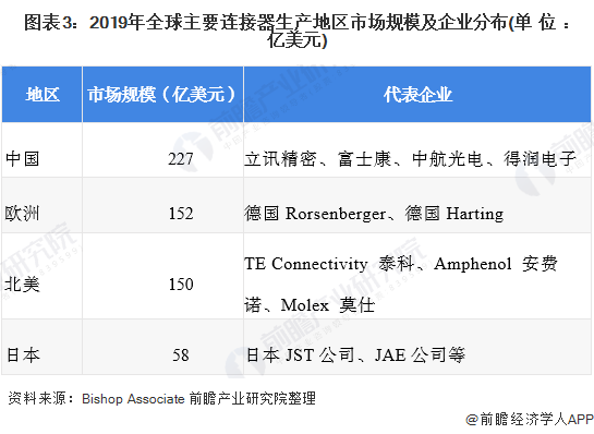 从全球各个地区来看,中国为目前连接器行业最大市场,2019年规模达到了227亿美元,代表生产企业有立讯精密、富士康、得润电子等;全球巨头公司基本集中在美国,包括泰科电子、安费诺等;欧洲市场上以德国企业为主要生产厂家;2019年日本市场规模达到了58亿美元,代表生产企业有日本JAE、日本JST公司等。