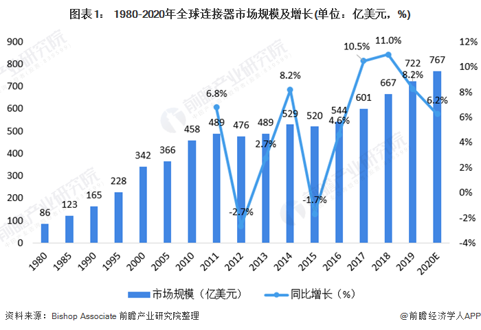 全球连接器行业处于稳步上升期,随着下游产业的发展和连接器产业本身的进步,连接器已经成为设备中能量、信息稳定流通的桥梁,总体市场规模基本保持着稳定增长的态势。根据Bishop&Associate的统计,2019年全球连接器市场规模达722亿美元,较2018年提升了8.2%。前瞻估算2020年全球连接器市场规模在767亿美元左右。