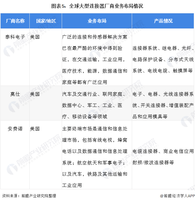 全球连接器行业处于稳步上升期,总体市场规模基本保持着稳定增长的态势。从全球连接器应用领域来看,目前汽车为下游最大市场,其次为通信行业;从区域发展格局来看,中国为全球连接器规模最大市场,但美国的厂商在市场竞争中尤其是高端产品市场占据领导地位,以全球大型厂商泰科电子、莫仕和安费诺为主要代表。