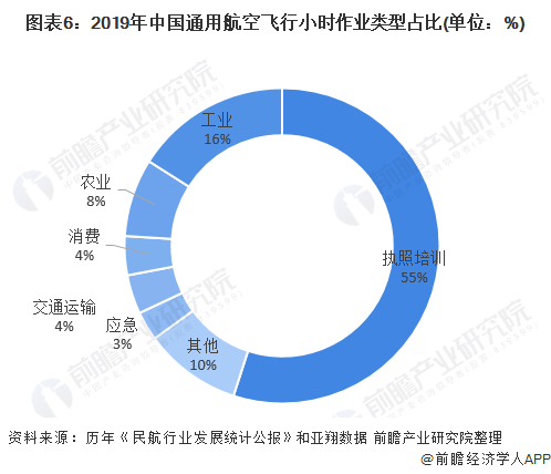 2019年,各通用航空飞行作业类型中,执照培训依旧占到了55%半数以上,其次依次为工业、农业、消费、交通运输和应急等。在当前工业和农业领域无人机有着逐步取代传统固定翼和直升机的趋势,但在通航消费(空中游览、跳伞飞行和个人娱乐飞行)、交通运输(包机和短途运输)和应急领域,仍然有着巨大的市场潜力。